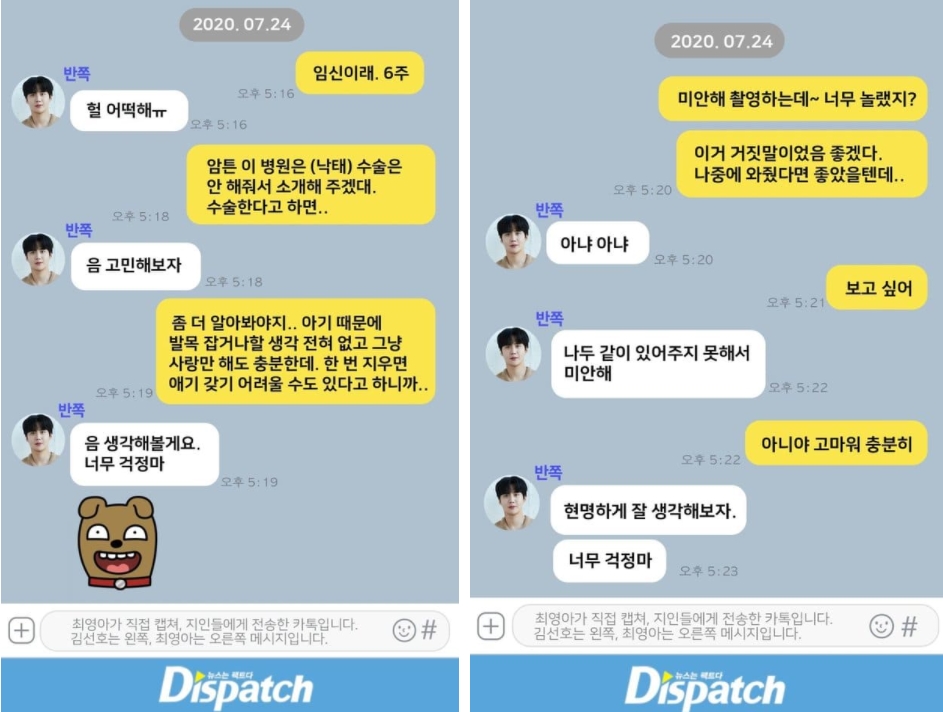 디스패치 임신사실 얘기하며 나눈 대화내용. Facebook 공유 twitter kakao email 복사. 2020년 7월 24일 a산부인과에서 b씨와 김선호와 카톡으로 대화를 나누었고 오후 5시 16분부터 8시 23분까지 총 284차례 메시지를 주고받았으며 김선호가 위로를 하는 그 순간에도 b 씨는 둘의 대화 내용 22장을 직접 캡처해 지인들에게 톡으로.